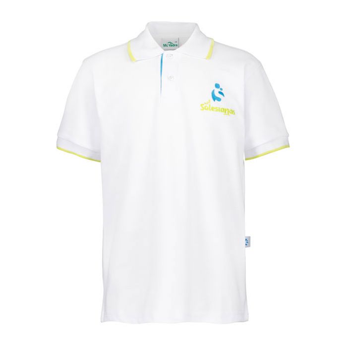 • Polo colegial de manga corta, realizado en pique con tapeta color turquesa.